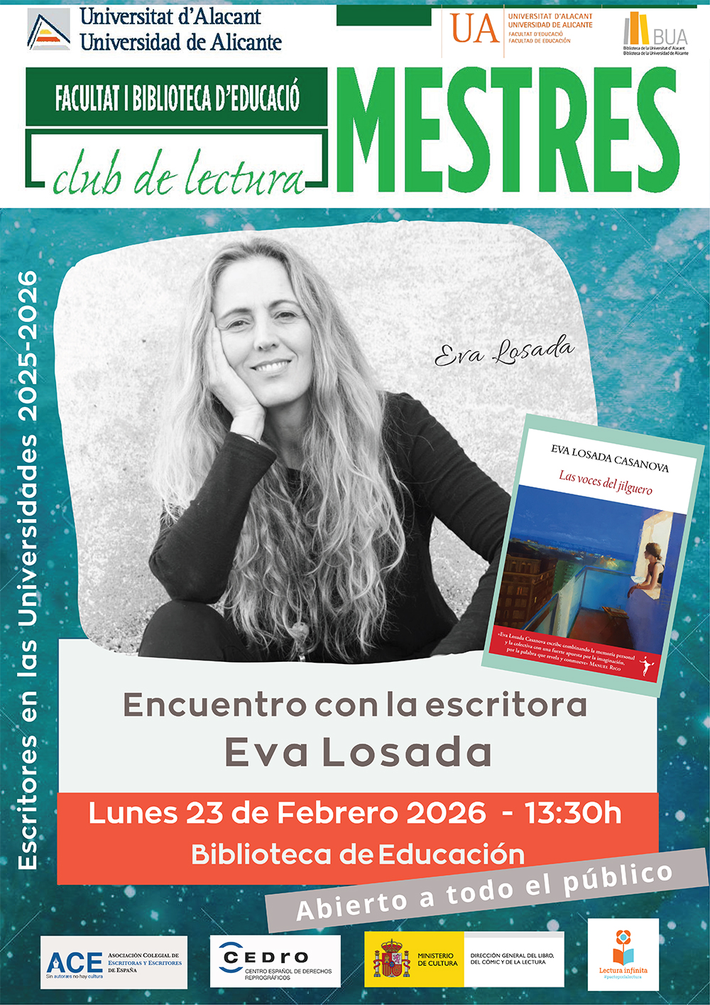 76 Eva Losada 0 FacebookTwitterLinkedinEmail previous post Barómetro de Hábitos de Lectura 2025: España consolida su hábito lector You may also like Antonio Orejudo en el Club de Lectura «Lo que vale una vida» 21 de enero de 2026 Lectura con Inma Chacón «Los silencios de Hugo» 26 de noviembre de 2025 Encuentro con la autora Bibiana Collado Cabrera 18 de noviembre de 2025 Clubes de lectura. UNIR. Traducir poesía inglesa con Jordi Doce 4 de noviembre de 2025 Escritores en las Universidades. Lola López Mondejar en el Club de Lectura... 30 de octubre de 2025 Comienza la tercera edición de «Escritores en las Universidades» (2025-2026) 15 de septiembre de 2025 José Luis Alonso de Santos en el Club de Lectura Nebrija 21 de enero de 2025 Comienza la segunda edición del programa «Escritores en las universidades 2024-2025» 9 de octubre de 2024 Comienza el programa «Escritores en las universidades 2024» 16 de enero de 2024 Las universitarias (1934), de Rafael Pellicer. Por qué este cuadro es la... 5 de abril de 2023